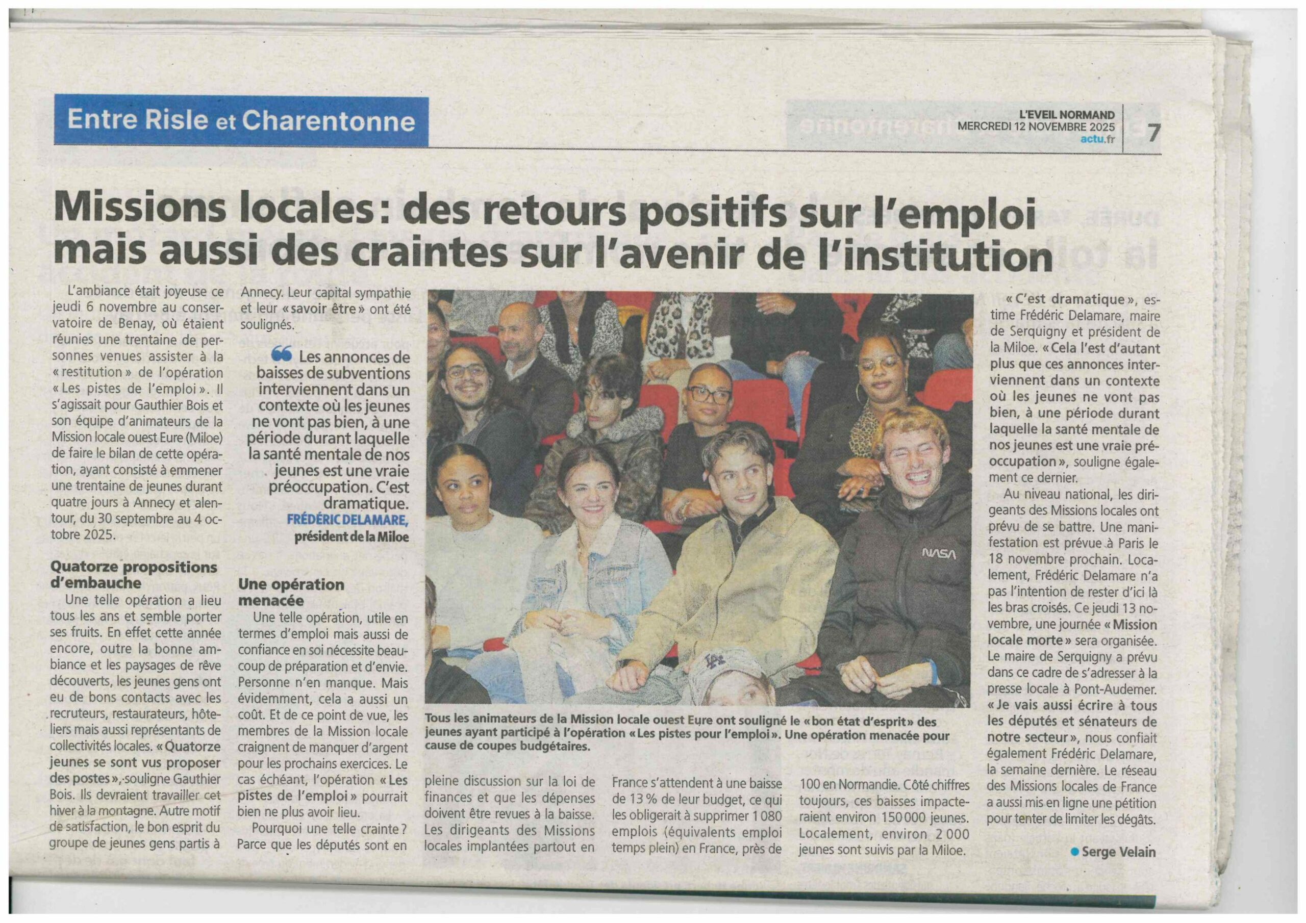 La Mission Locale s’est rendu en Savoie au début du mois d’Octobre à l’occasion des Pistes de l’Emploi. Le 06 Novembre 2025, avait lieu la restitution de ce séjour au conservatoire de Bernay. Un retour positif avec 14 propositions d’embauche, mais des craintes surviennent sur l’avenir de l’institution.